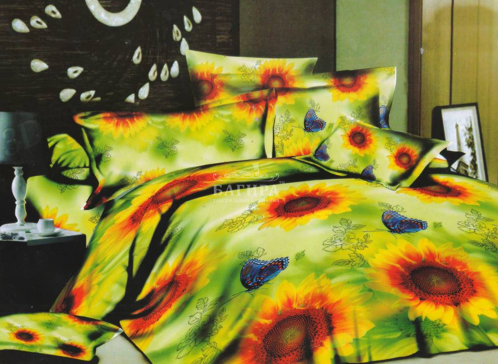 Постельное бельё "Полисатин 3D" Подсолнух с бабочкой