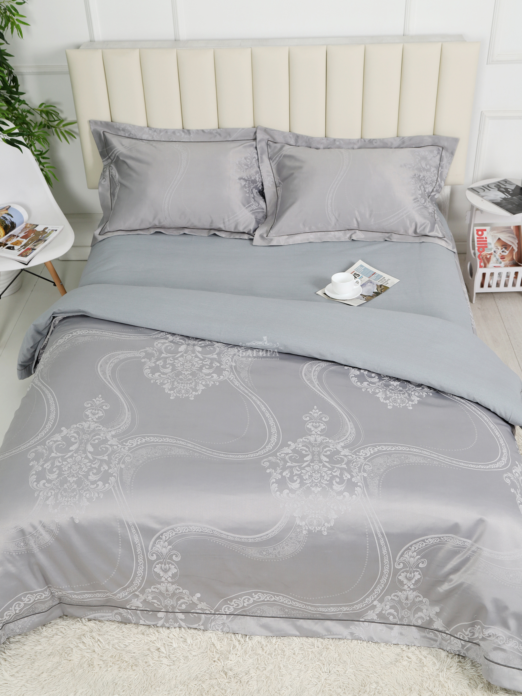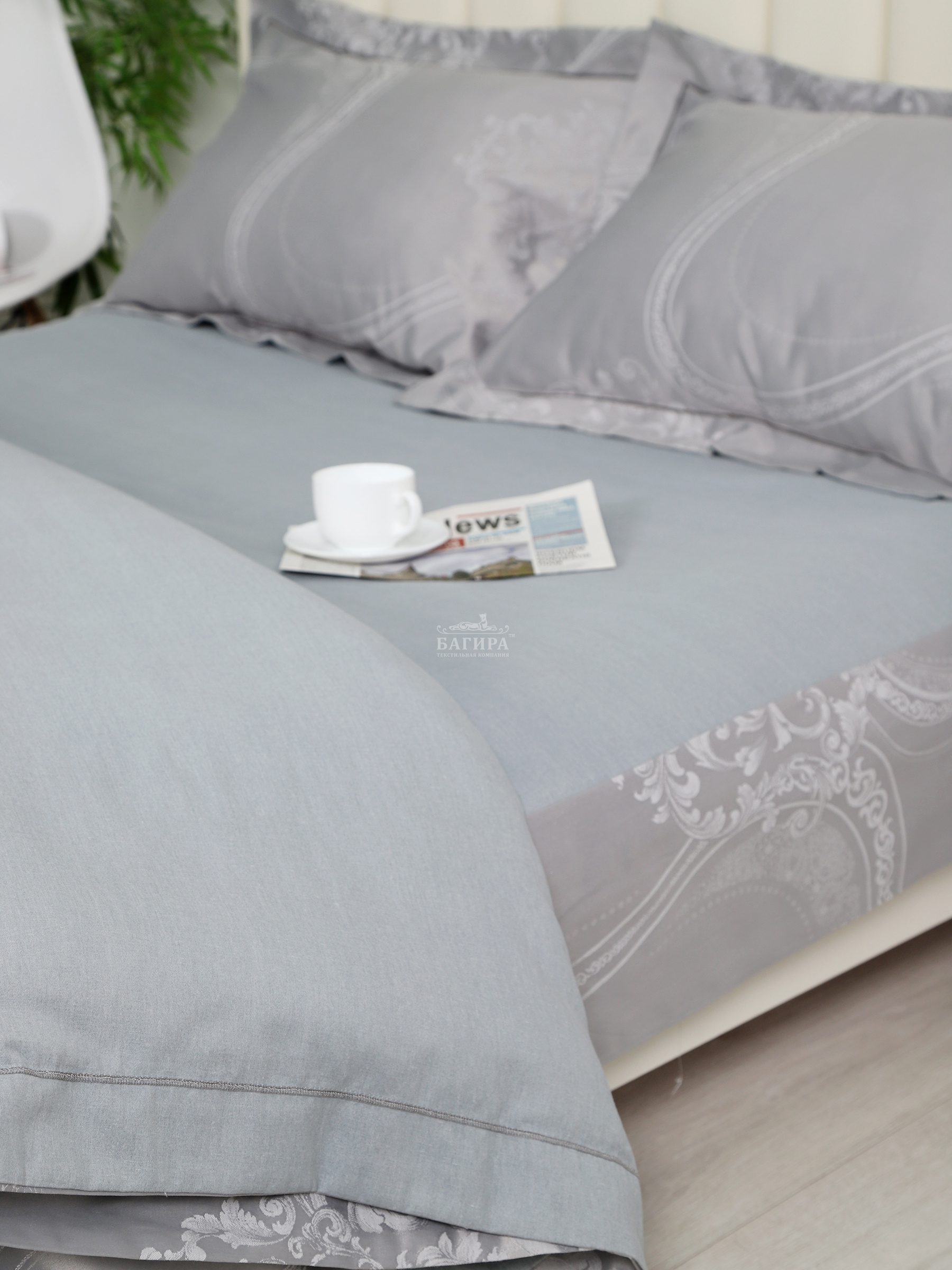 Пододеяльник 200х220 см: верх- жаккард (50% хл., 50% п/э), низ- сатин однотонный (100% хл.).