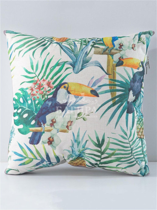 Чехол подушки выполнен из имитирующий лён ткани с печатным рисунком с одной стороны и без рисунка с другой. Плед-одеяло — из мягкой микрофибры цвета кофе с молоком с наполнителем из полиэфирного волокна. Размер в виде подушки 50х50 см, в виде одеяла — 140х200 см.